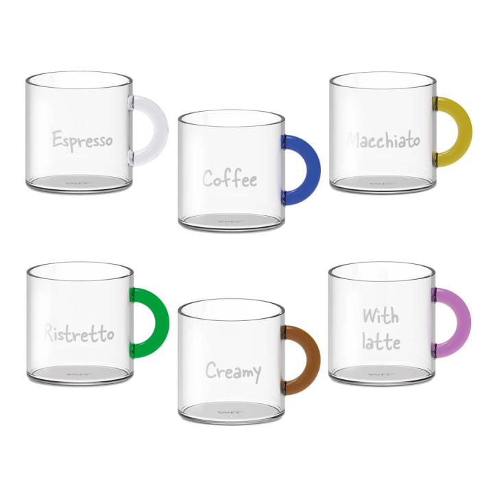 Set 6 tazzine da caffè in vetro borosilicato trasparente con manico colorato e scritta decorativa