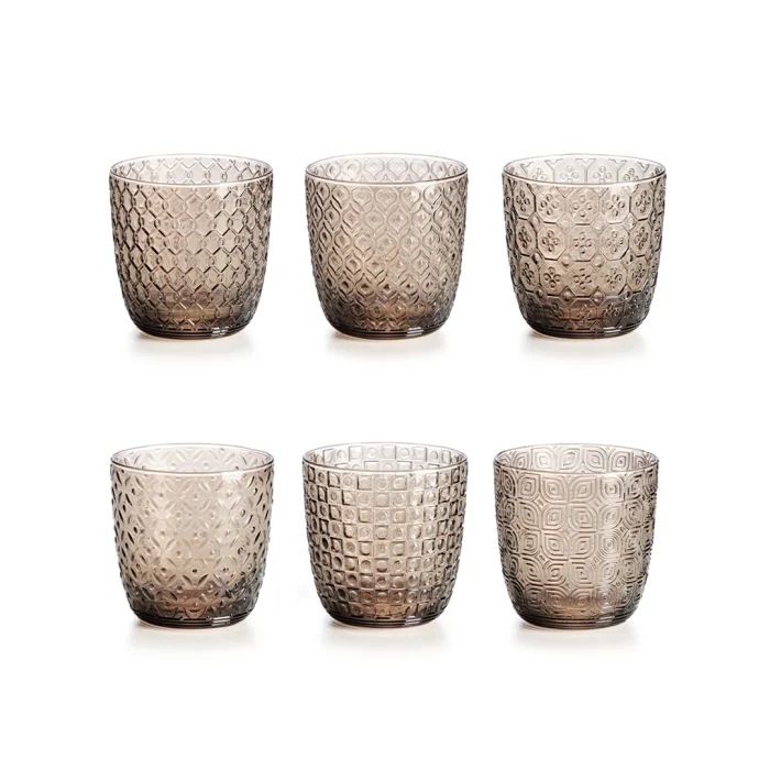 Confezione da 6 bicchieri in vetro soffiato colorato nella massa, caratterizzati da sei ottiche differenti ispirate a motivi degli anni ’60, ideali sia per la tavola quotidiana che per quelle più eleganti.