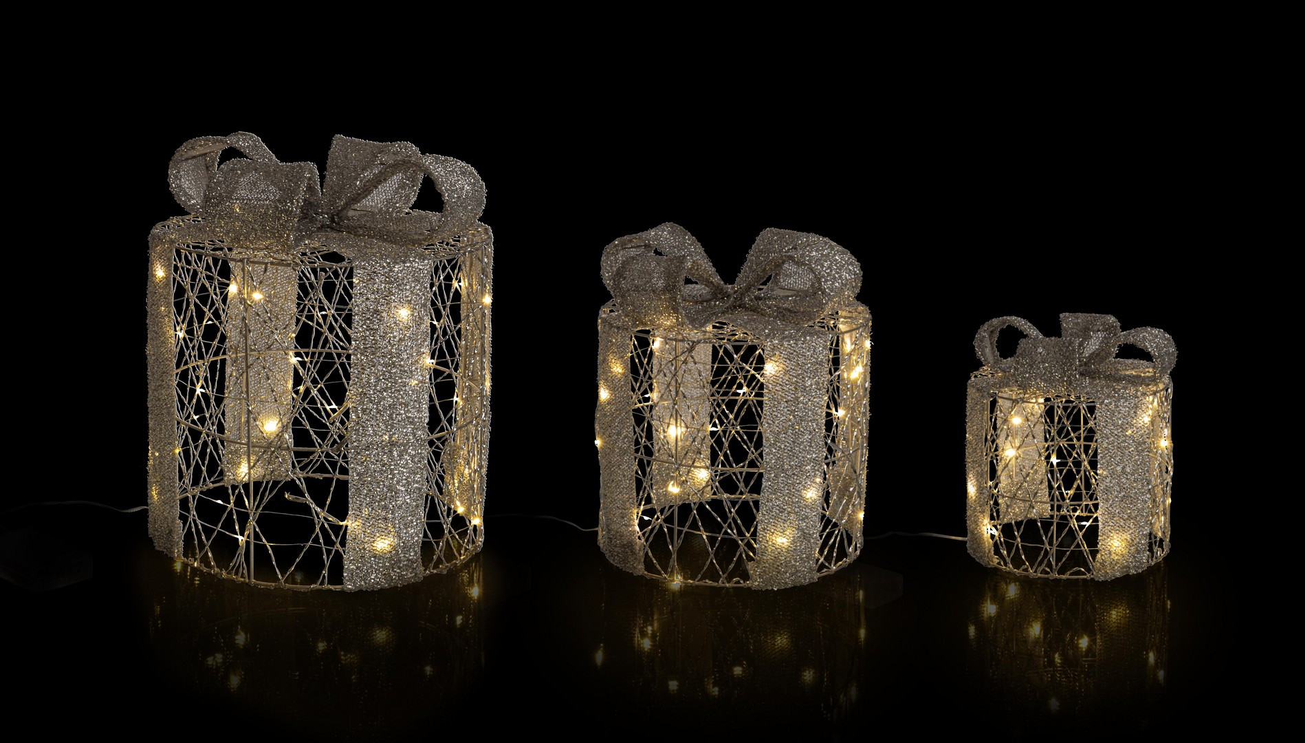 DettagliSET COMPOSTO DA 3 DECORAZIONI LUMINOSE, 90MICROLED IN TOTALE: 20MICROLED, 30MICROLED, 40MICROLED. STRUTTURA IN ACCIAIO VERNICIATO A POLVERE EPOSSIDICA E POLIETILENE. STRUTTURA IN COLOR ORO,FILO IN COLORE ARGENTO. LUCE CLASSIC, LUNGHEZZA CAVO DI ALIMENTAZIONE 0.3 MT, DISTANZA LED 10CM. SOLO PER USO INTERNO IP20. MISURA S: FUNZIONA A BATTERIA 2XAA NON INCLUSE. MISURA M+L: FUNZIONA A BATTERIA 3XAA NON INCLUSE.