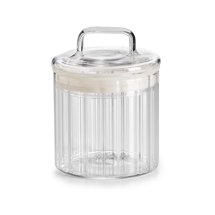 Zuccheriera con tappo, in vetro borosilicato trasparente, con superficie plissé.