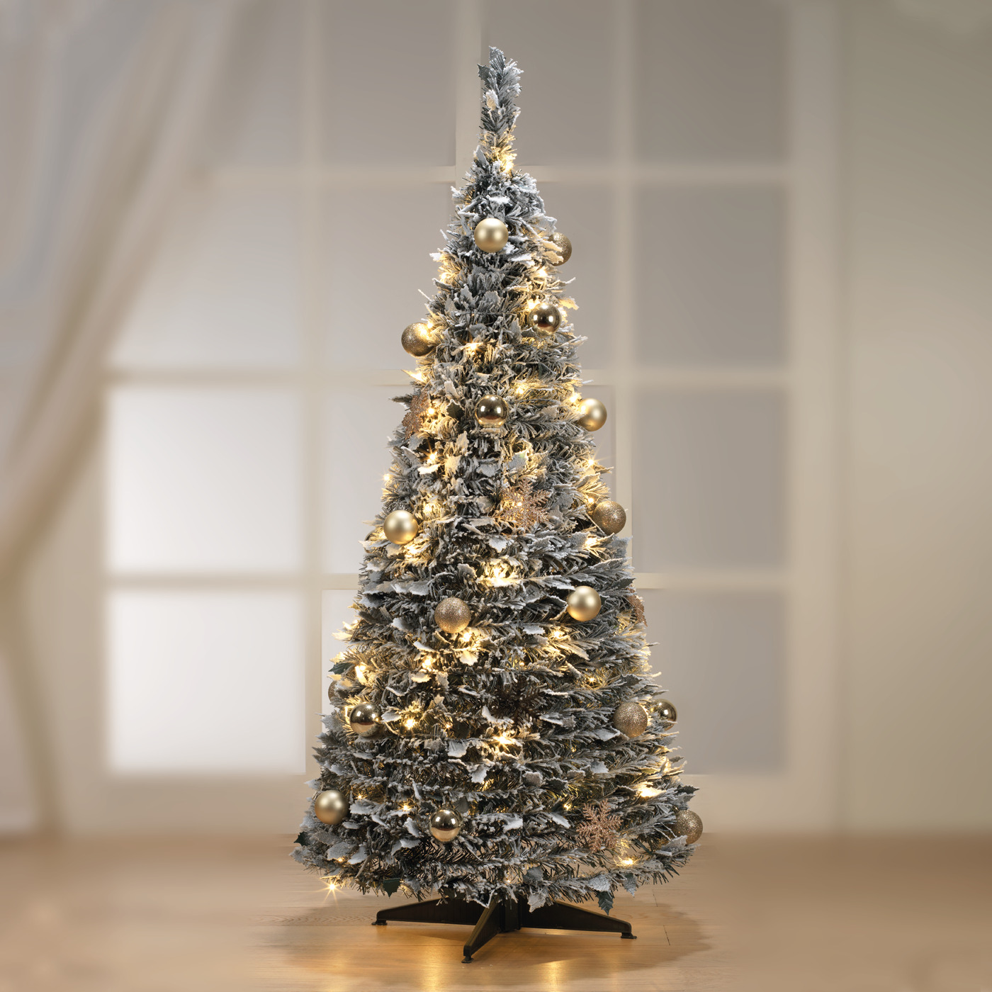 Albero di Natale pop-up in stile abete, facile da montare e riporre. Dotato di 100 LED e decorazioni integrate. Alimentazione con trasformatore incluso. Diaametro 63x150