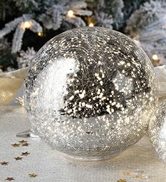 Mascagni Sfera led oro. Linea di decorazioni ’christmas time’ composta da sfere da tavolo in vetro craquelé   argentato con luci a led . Alimentazione a batteria (pile non incluse). Dimensione: ø 15 cm.