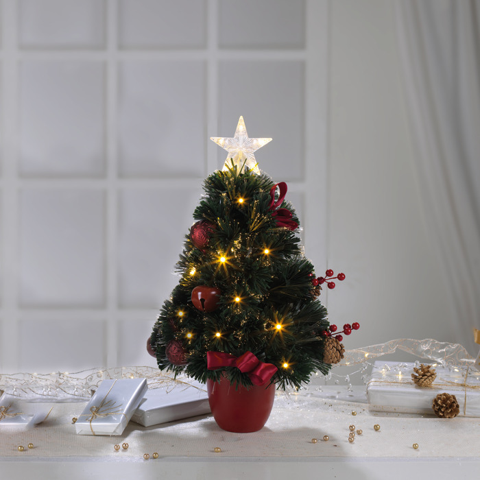 Albero di Natale con fibra ottica e led flash, decorato con fiocchi, foglie e palline colore rosso e puntale a stella illuminato. Completo di vaso. Alimentazione elettrica con trasformatore. Grado di protezione IP20. Altezza: 60