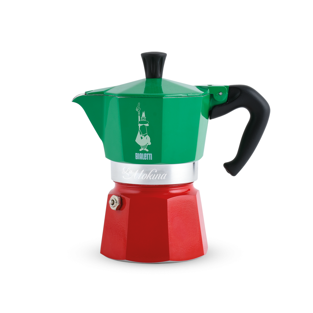La versione Tricolore della Moka Express vuole celebrare anche nei suoi colori, il tradizionale rito italiano di preparare un buon caffè.